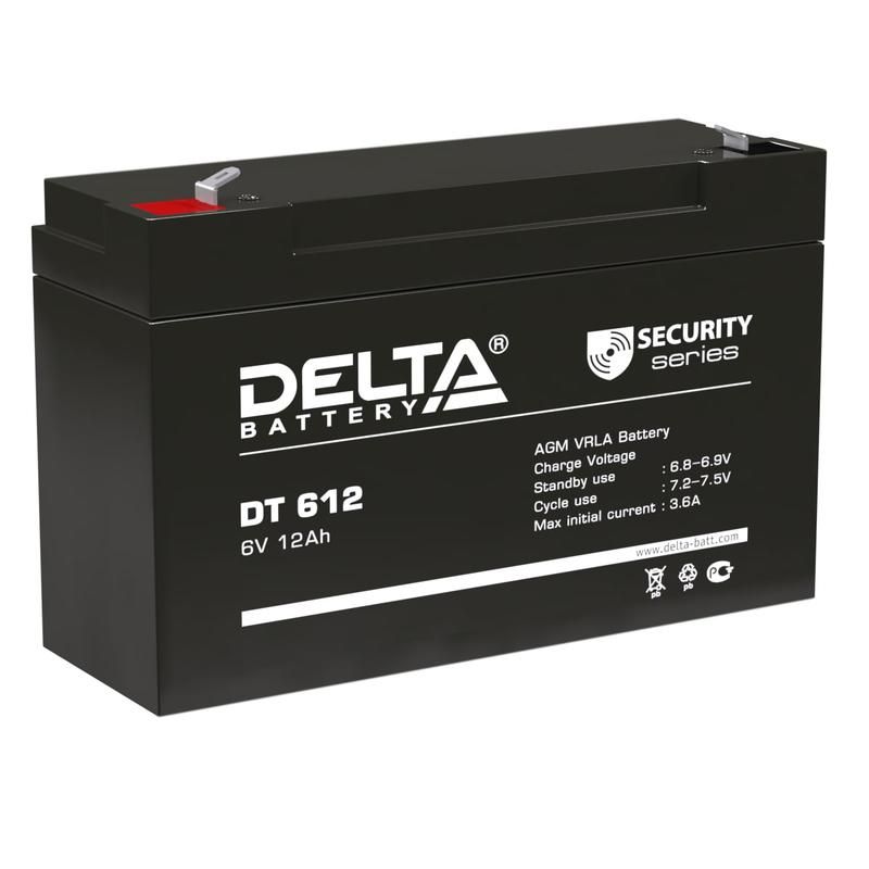 Аккумуляторная батарея Delta DT 612. Напряжение 6В, емкость 12Ач. Имеет низкое внутреннее сопротивление и высокую плотность энергии. Предназначена для охранно-пожарных систем и СКУД. Срок службы 5 лет.