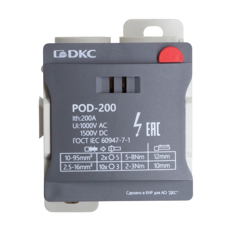 Распределительный блок POD-200 с винтовым зажимом служит для соединения и распределения многожильных или обжатых наконечником гибких проводников в электрических щитах. Установка на DIN-рейку высотой 35 мм или монтажную плату. Боковой штифт обеспечивает стыковку блоков между собой. На крышке распределительного блока нанесена ключевая информация, а также есть паз для маркировки NUTB5. В комплект входит цветная пластиковая маркировка (синий, зеленый, красный, желтый) и самоклеящаяся (L1, L2, L3, N, заземление, круг). Корпус выполнен из полиамида с классом горючести V0 UL-94. Степень защиты – IP20. Цвет – серый, 2 ввода с сечением 10-95 мм2, 10 точек подключения (выводов) с номинальным сечением проводников 2,5-16 мм2. Габариты (В?Ш?Г) – 50?50,5?67,5 мм.