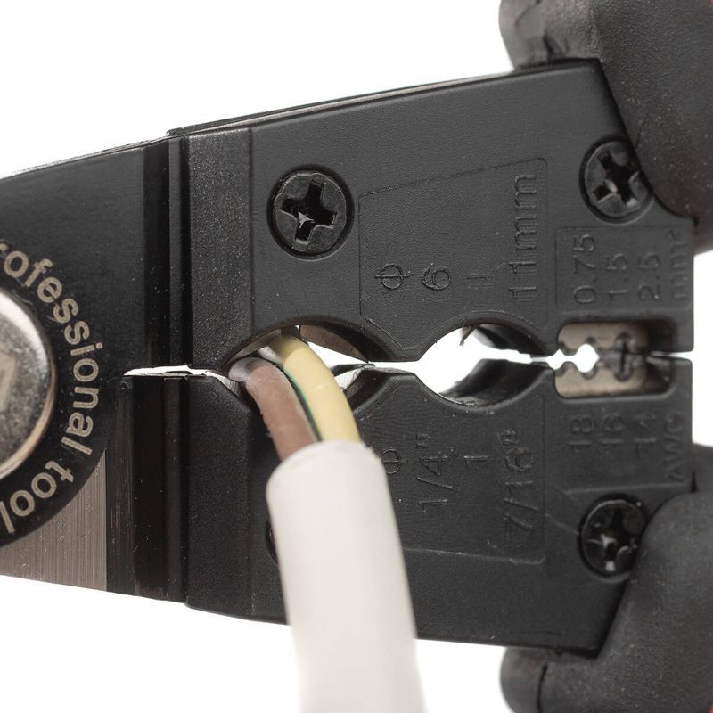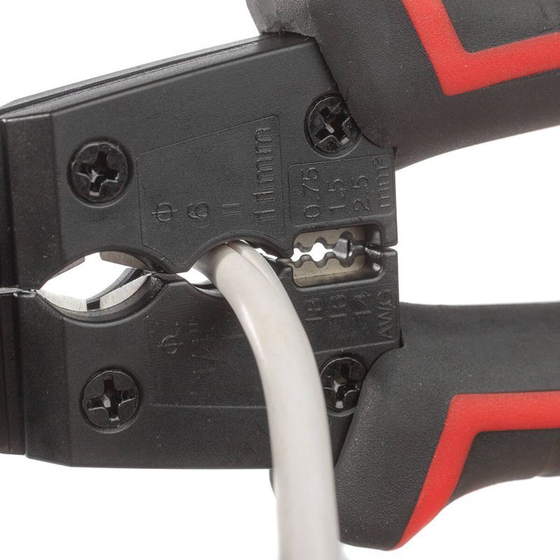 • 4 в 1: • резка проводов ? до 10 мм • снятие жильной изоляции с проводов сечением от 0.5 до 2.5 мм2 • поперечная разделка оболочки круглых кабелей ? от 6 до 14 мм • продольная разделка оболочки круглых кабелей ? от 6 до 11 мм • Трехпозиционные прецизионно заточенные лезвия для зачистки проводов: • гнездо «0.75» для проводов сечением 0.5–0.75 мм2 • гнездо «1.5» для проводов сечением 1–1.5 мм2 • гнездо «2.5» для проводов сечением 2.5 мм2 • Двухкомпонентные нескользящие рукоятки • Скоба для блокировки рукояток • Возвратная пружина • Вес инструмента: 200 г • Длина инструмента: 185 мм